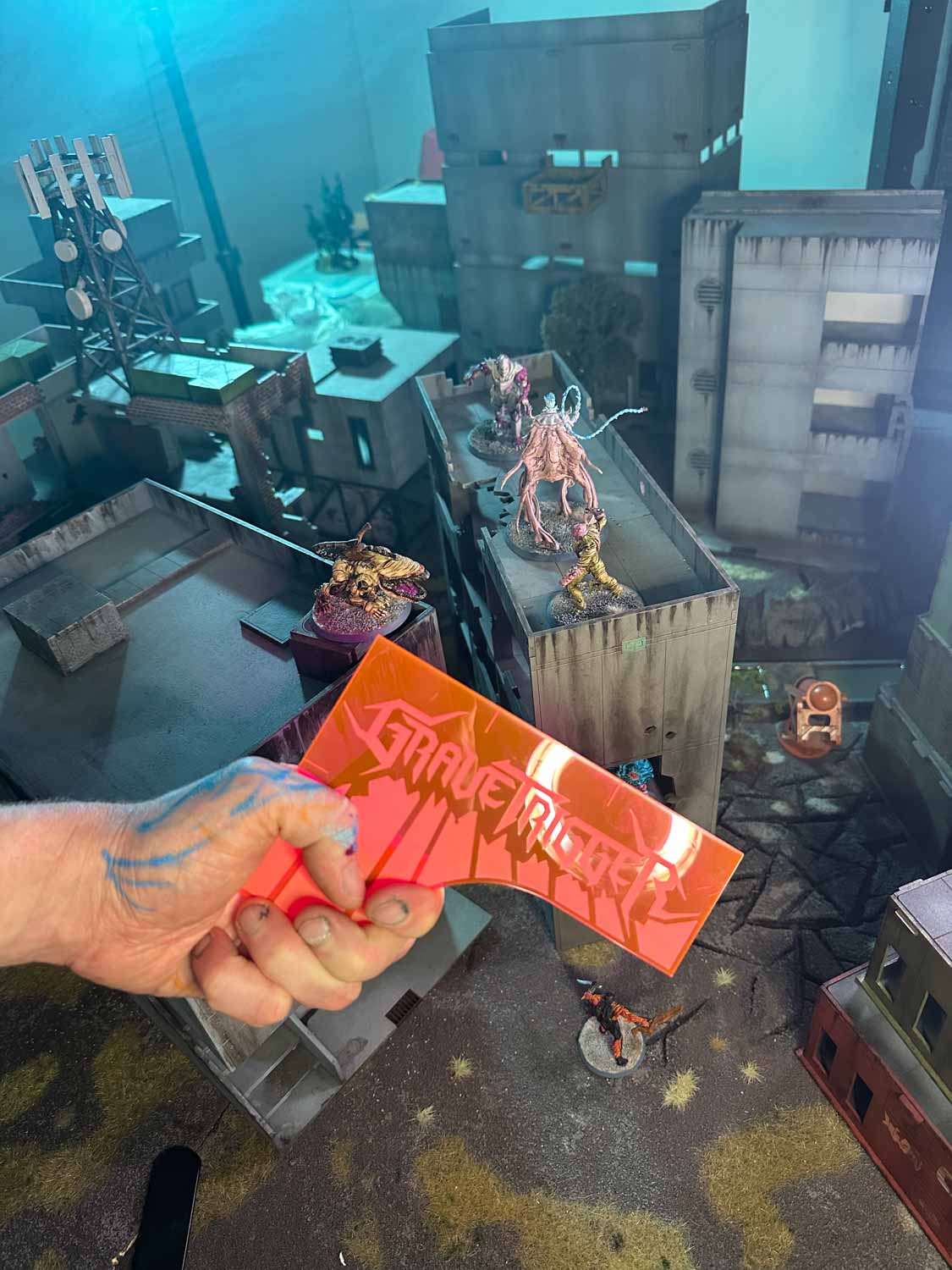 The structure itself is also large enough to fit most of the massive Grave trigger miniatures. This terrain kit would be an epic centerpiece for any sci-fi tabletop game, and the cantilevered shanties allow the large bases to fit and fight on the side of the structure.
