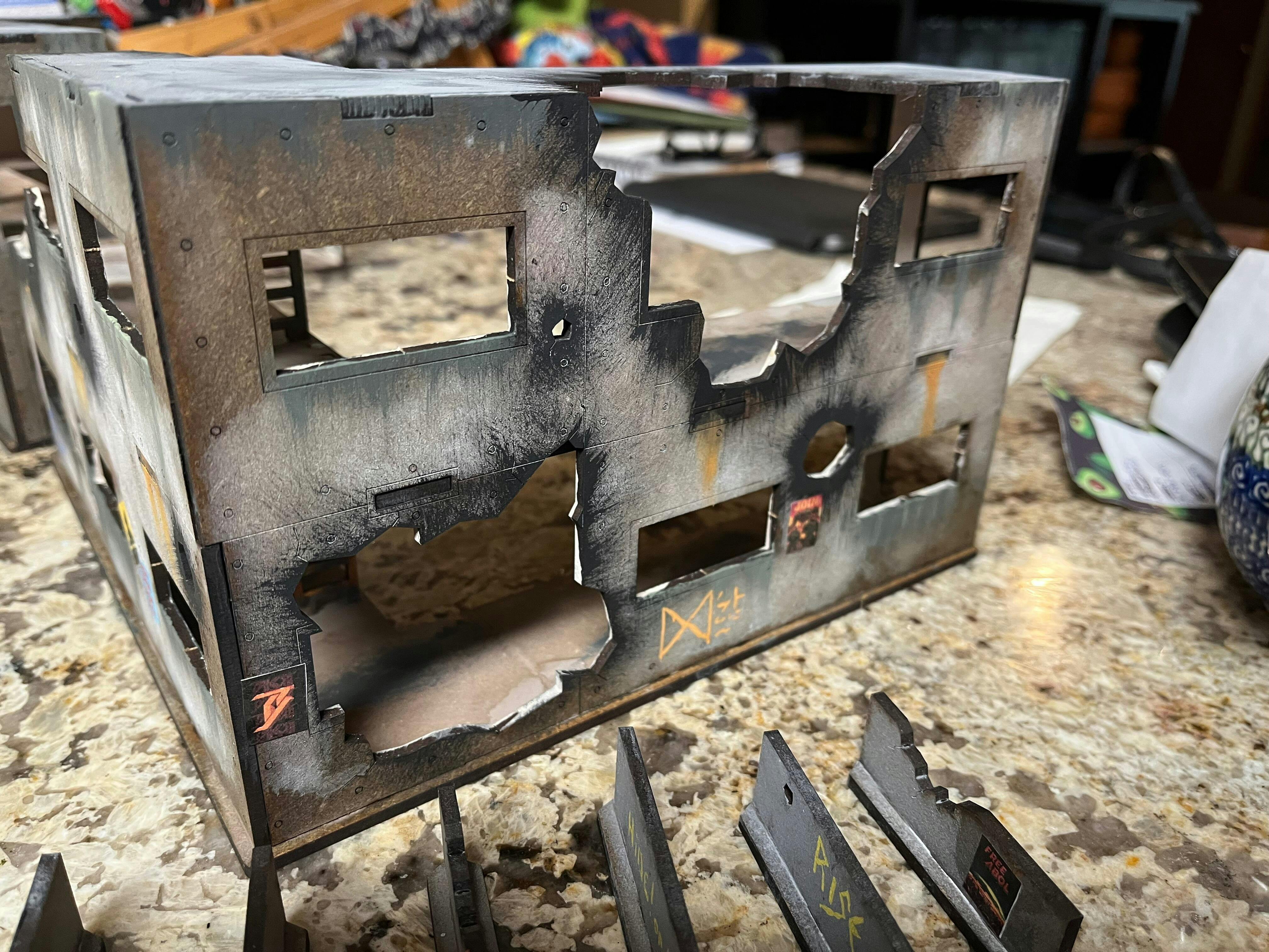 This HUGE building definitely looks great on the table. Video instructions made assembly easy. I love how there was so much room for adding graffiti and weathering. Lots of playable areas, stairs, balconies, roof, interior of upper floor. The stairs fit up to a 40mm base which is great. Super sturdy one assembled as well.
