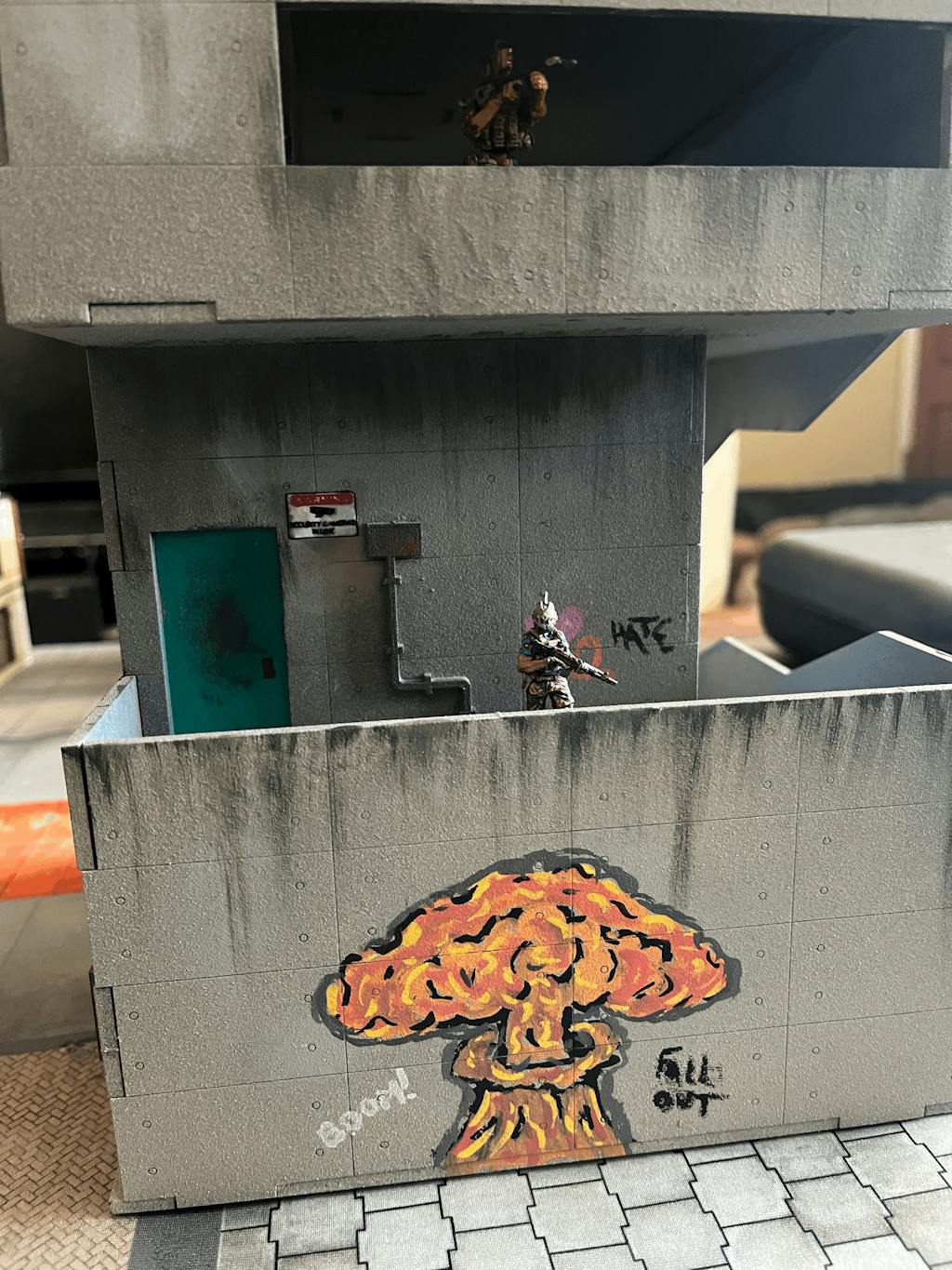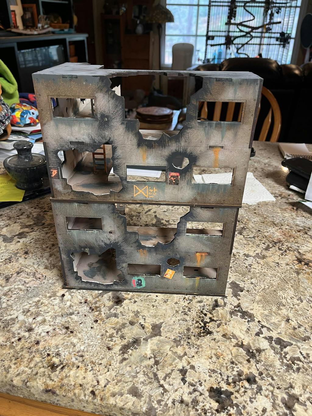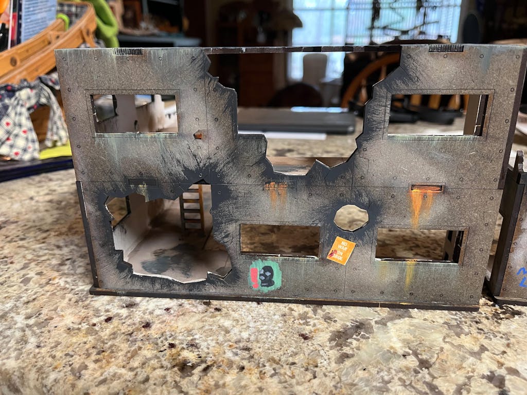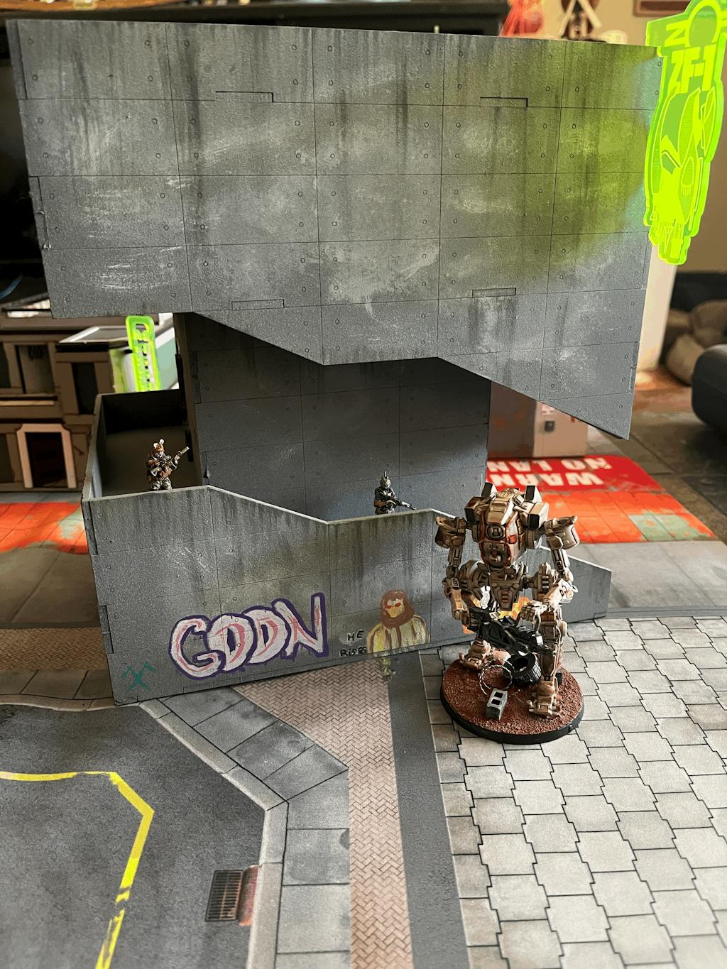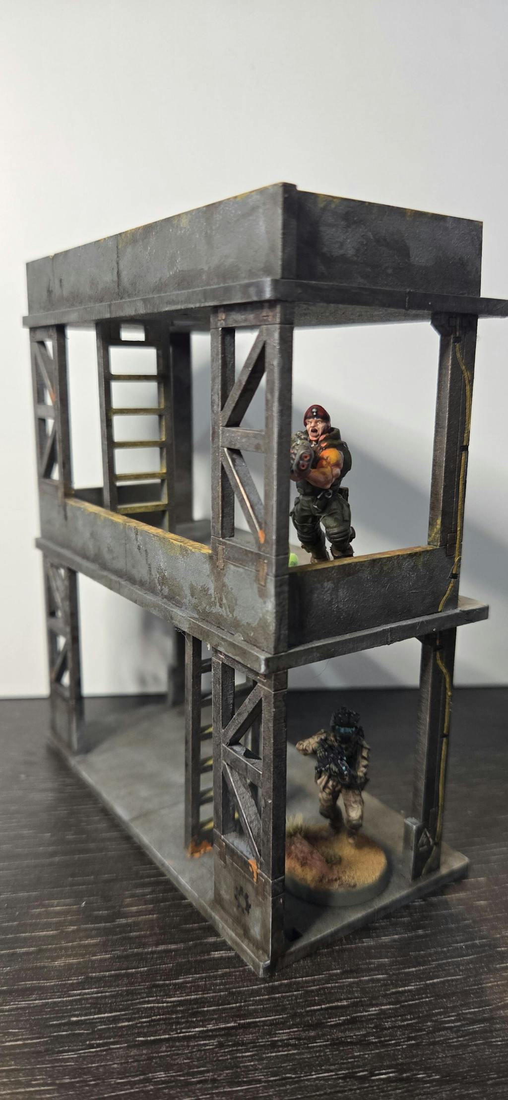 This HUGE building definitely looks great on the table. Video instructions made assembly easy. I love how there was so much room for adding graffiti and weathering. Lots of playable areas, stairs, balconies, roof, interior of upper floor. The stairs fit up to a 40mm base which is great. Super sturdy one assembled as well.