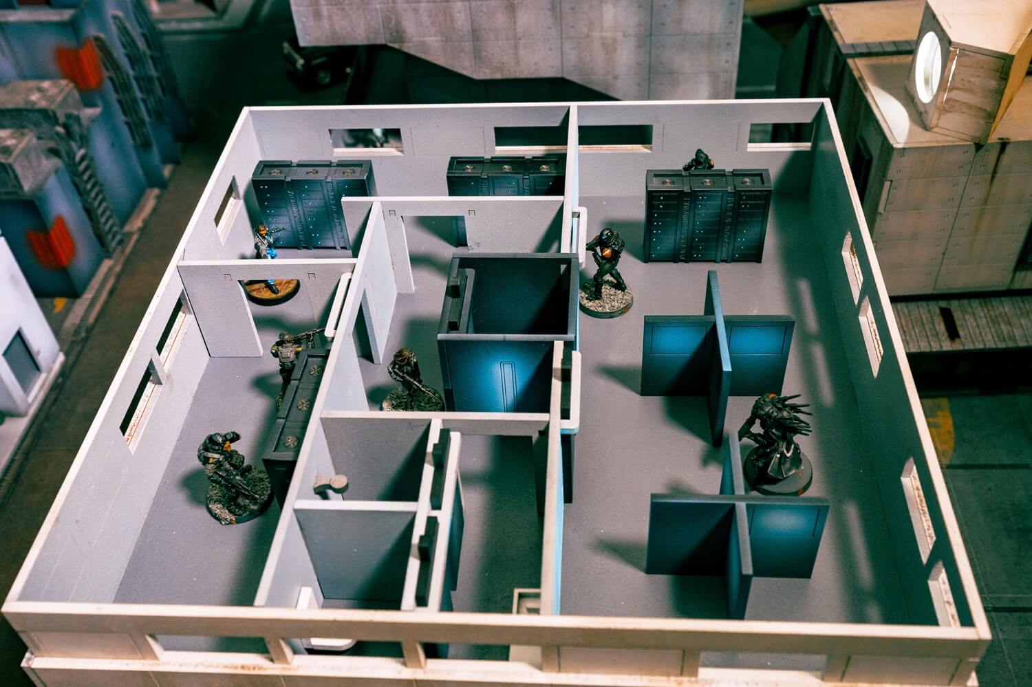 The interior walls provide a playable layout with operable sliding doors with handles. The corridor is wide enough to fit 32mm bases.